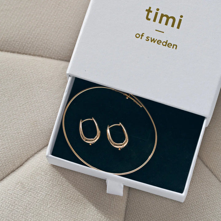 This classy set is timeless and easy to style. The bangle is adjustable and the golden hoops go with every outfit. The set comes as a gift set, with a gift box.