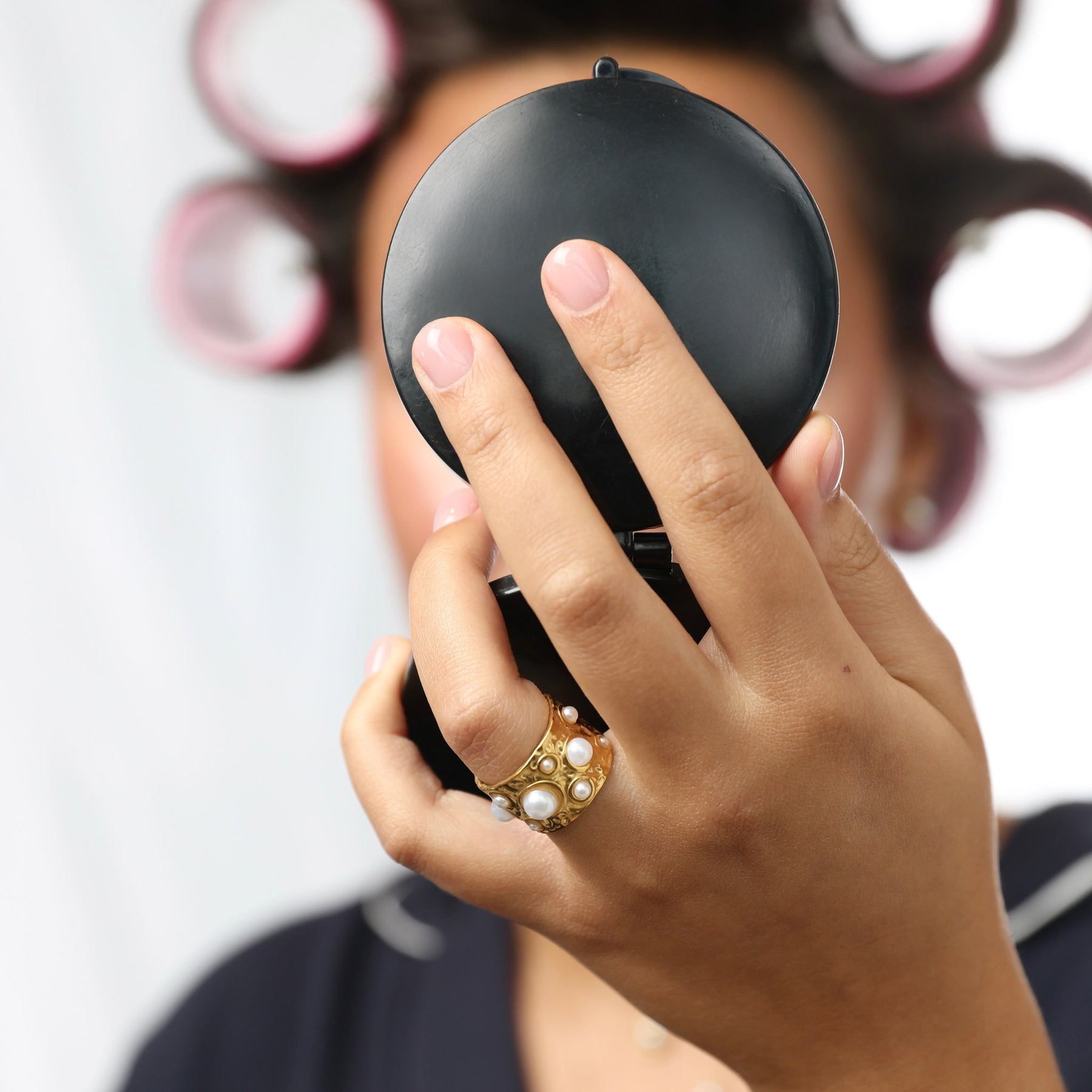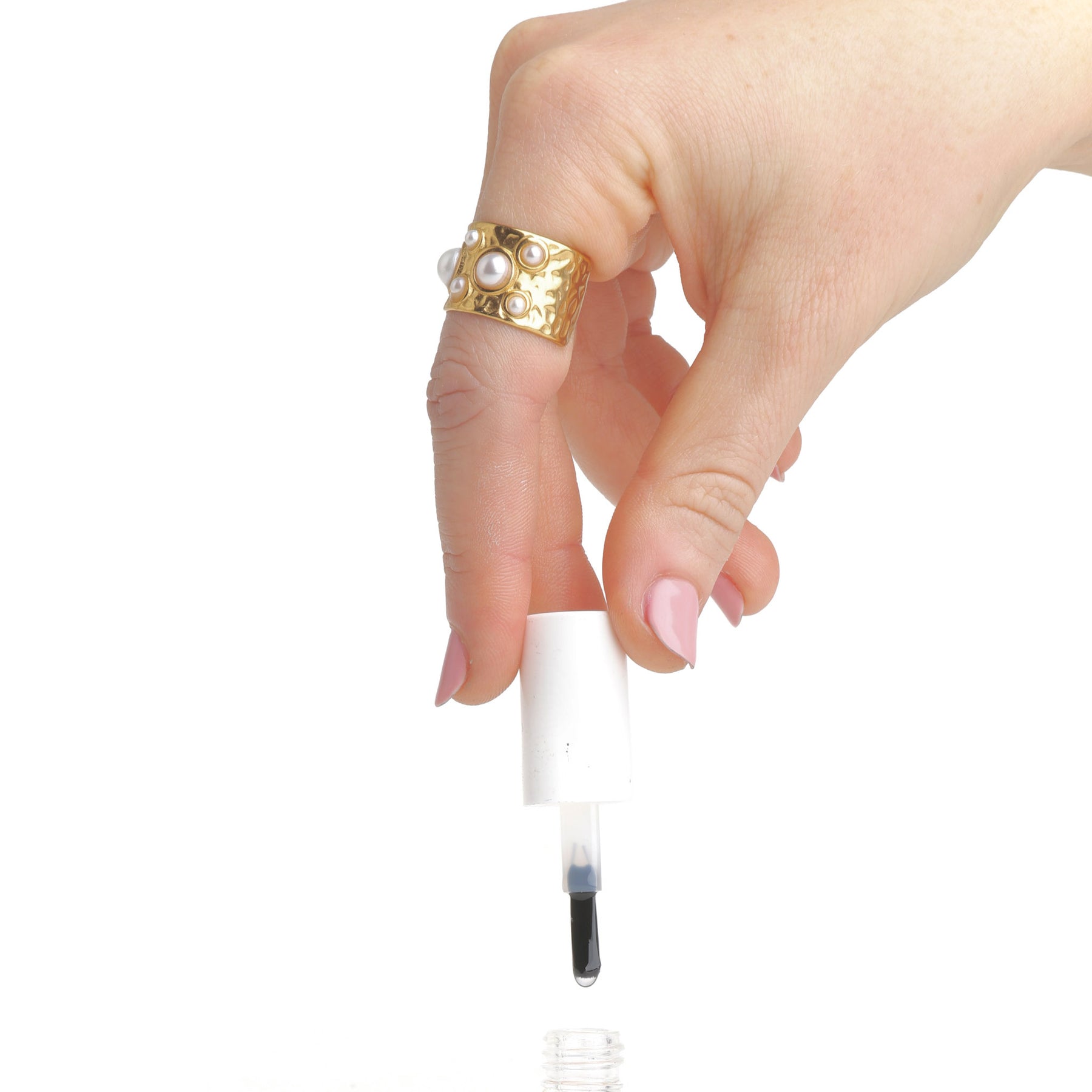 A hammered ring with pearl details, crafted in waterproof stainless steel.