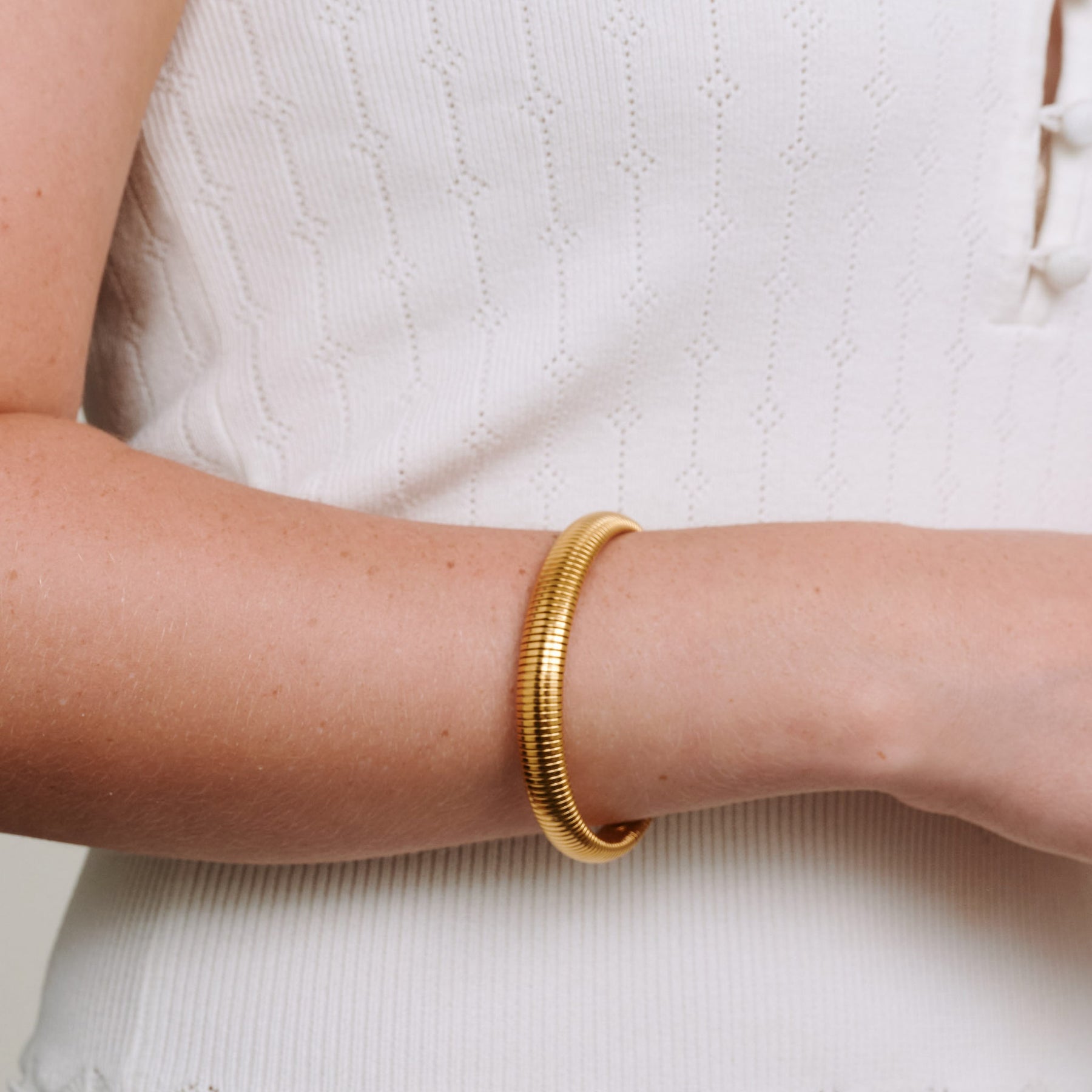 Easy wear and sleek style with this stretch bangle bracelet. This comfortable stainless steel bangle offers a flexible stretch fit, is water-resistant, and tarnish-free for effortless accessorizing. Available in silver & gold to fit your style and needs.