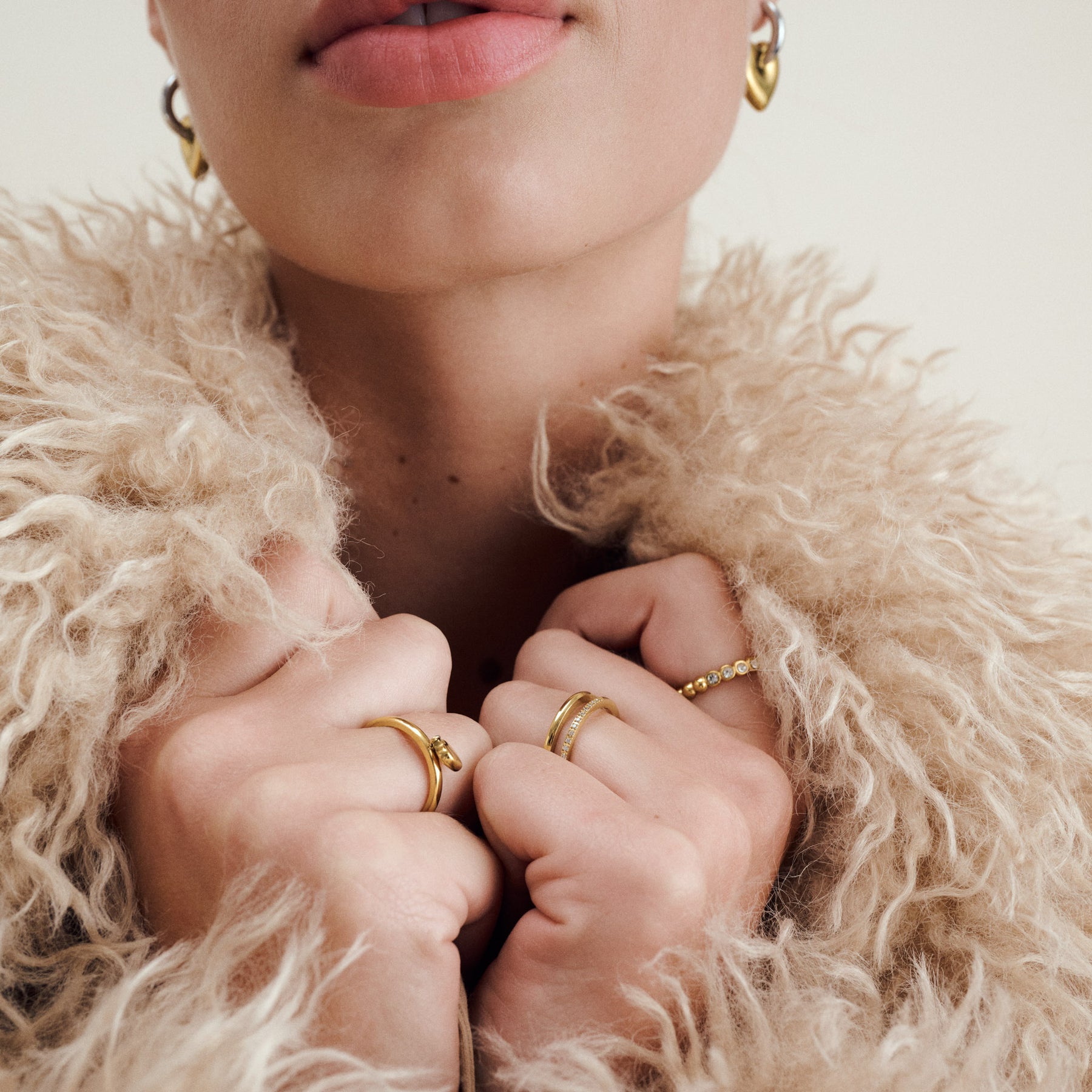 The Pernilla ring is crafted in waterproof stainless steel with a bold, textured band set with sparkling crystals. Available in silver and 18k gold plating.