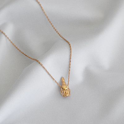 A minimalistic and beautiful pendant necklace resembeling a Buddha head on a thin chain, in silver. The necklace is perfect to wear as it is, or style with another simple chain.