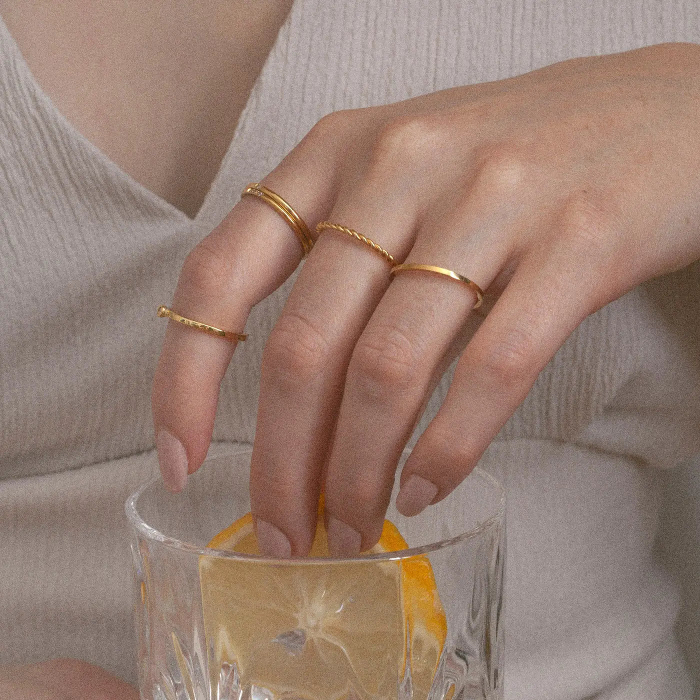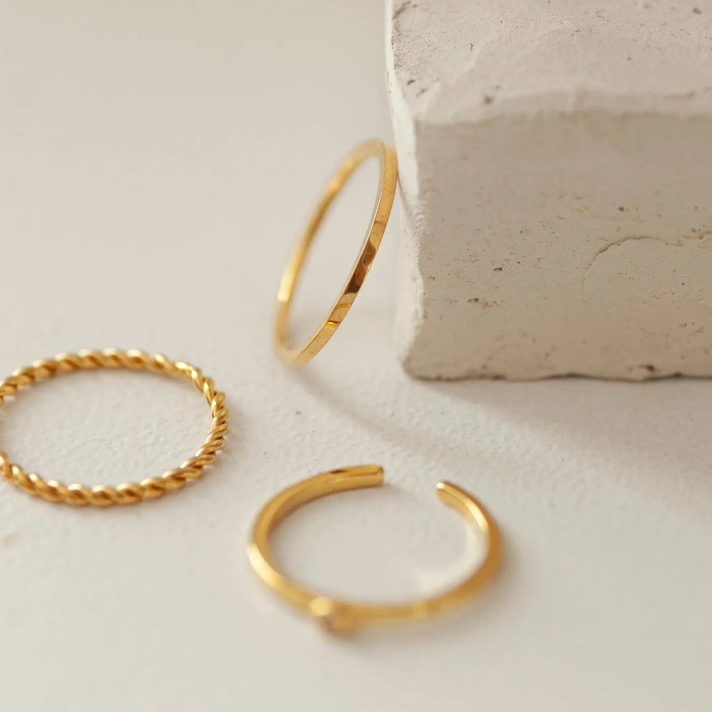 Our new stainless steel collection offers a range of total waterproof jewellery. Shower, swim and exercise without tarnishing your fave pieces. Discover the best basics in town! This simple and polished gold ring has squared edges and is a perfect everyday accessory and staple for your jewellery wardrobe! This is a piece you’ll never regret buying. It is versatile and easy to style!