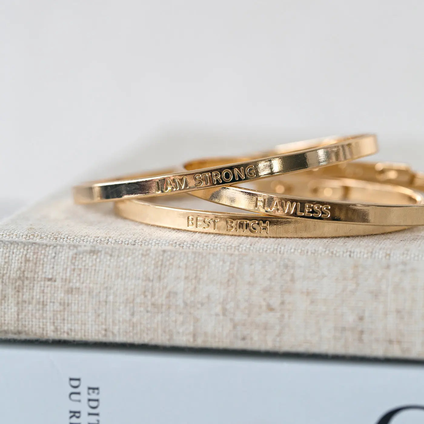 The "I Am Strong Bangle" bracelet is inspired by the beauty and appeal of simplicity with an edge. And it will make the perfect addition to your everyday look. Our jewelry always comes with gorgeous packaging. Brass based bracelet with gold plating. Lead, Nickel and Cadmium Free