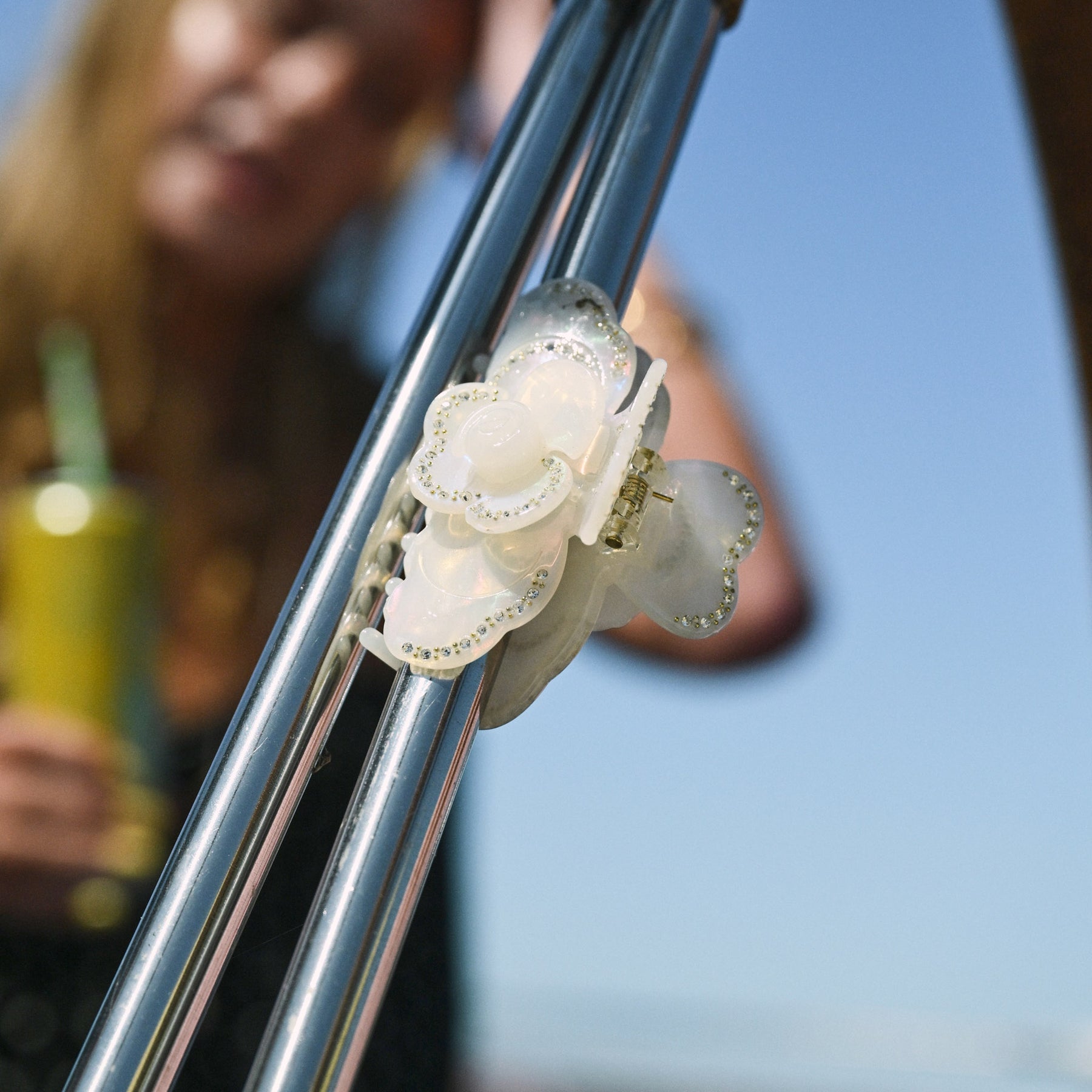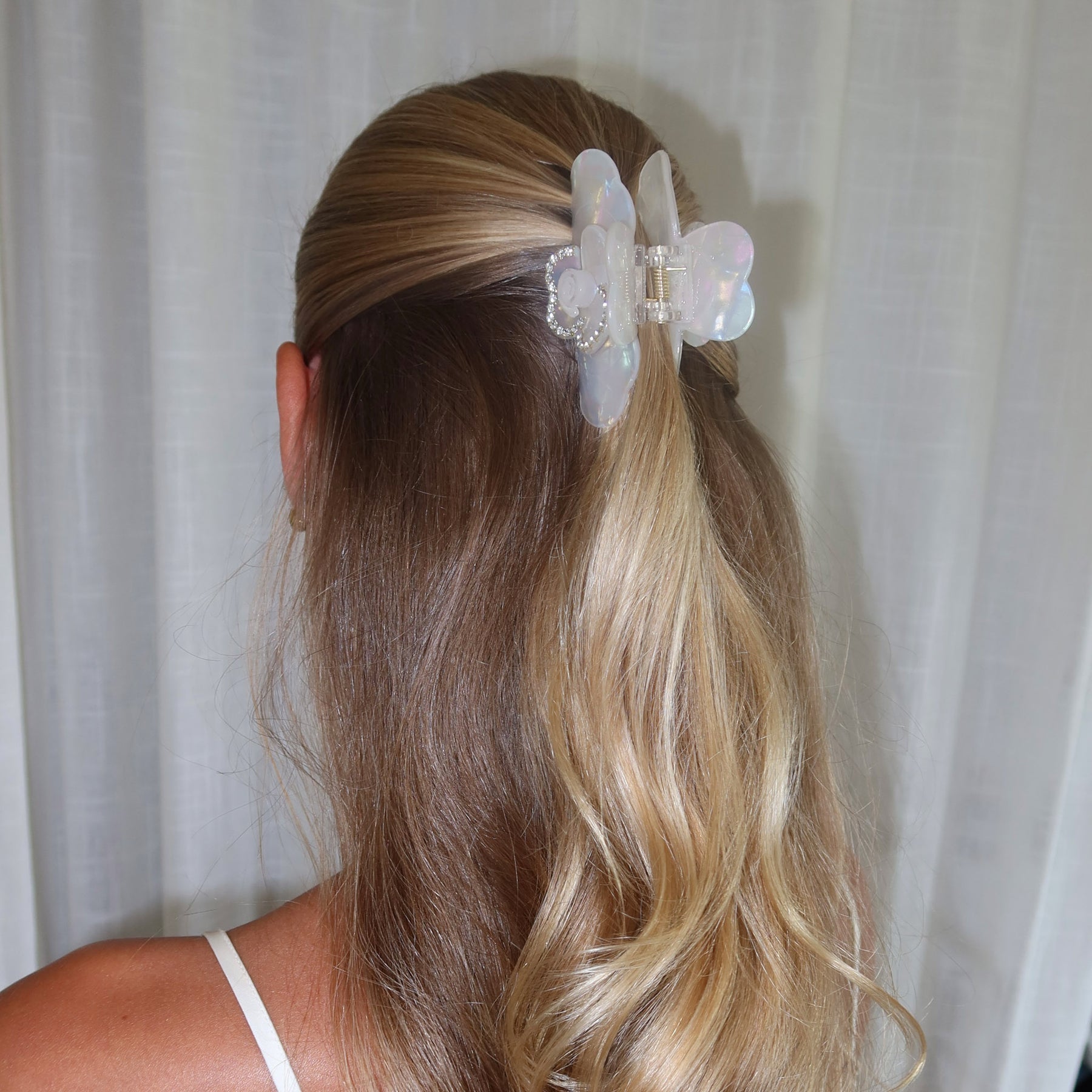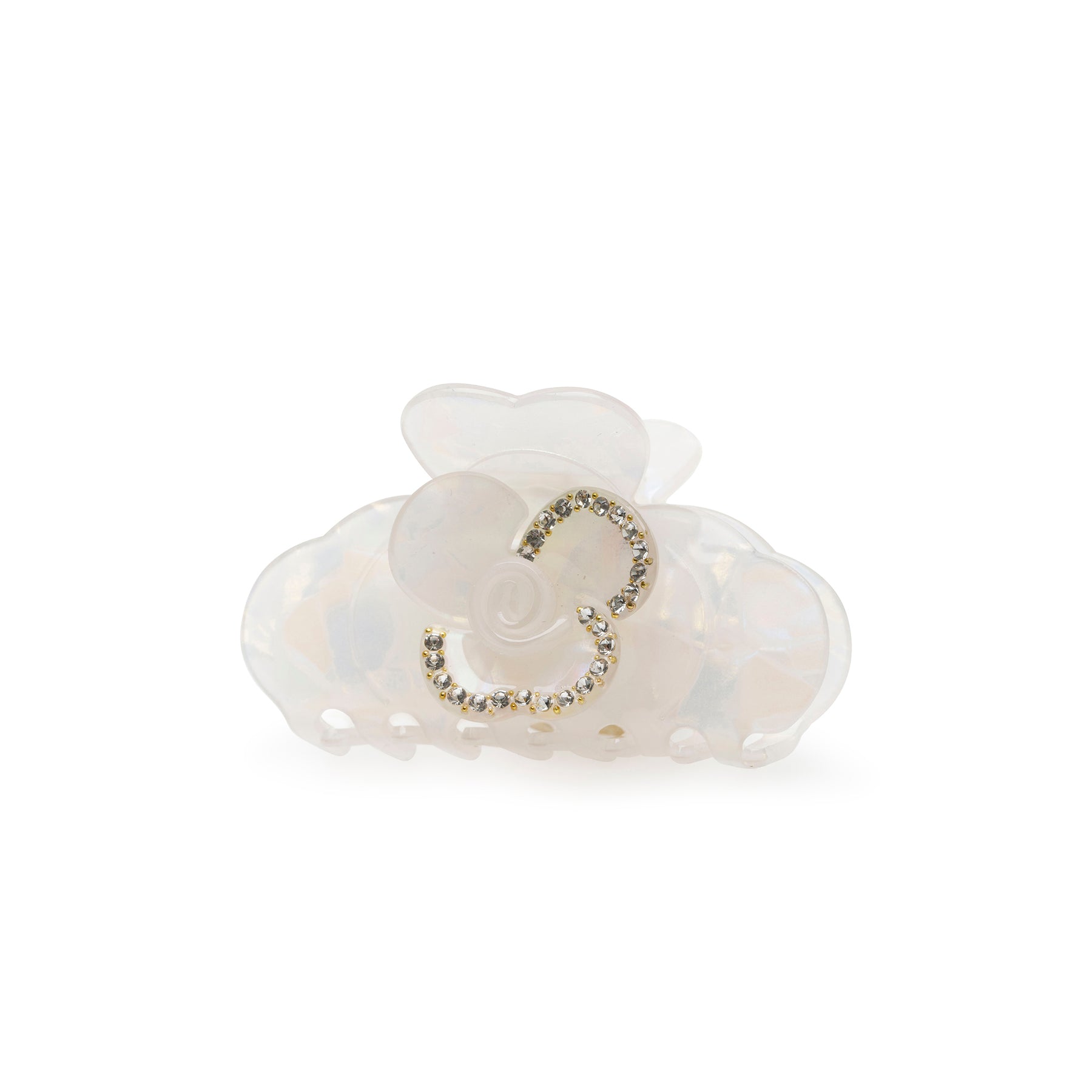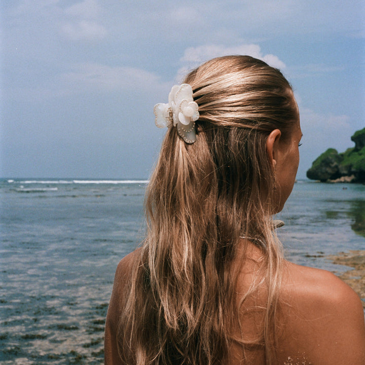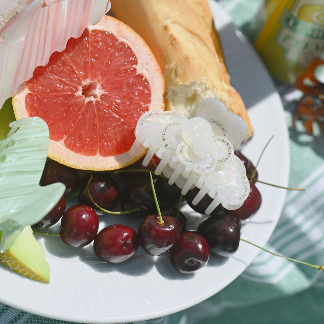 Your hair's new BFF just dropped! This dreamy, iridescent white claw clip features a cute floral design with subtle sparkle. Effortless glam for all your iconic moments.