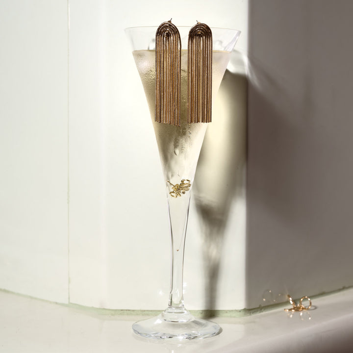 Step into the spotlight with the Lisanne Long Chain Earrings. Their arched, flowing design and shimmering details make these chain earrings the ultimate showstopper for any party or event.