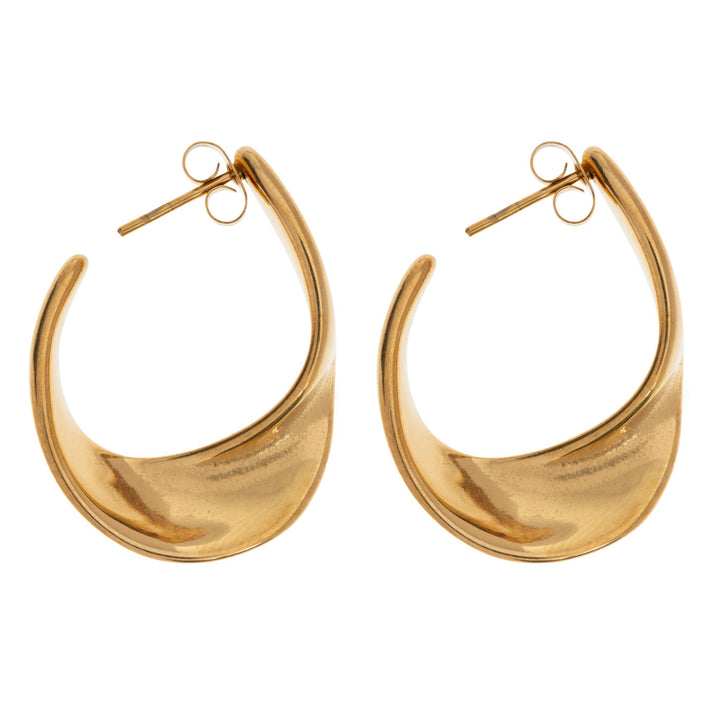 Beautiful stud hoops in an irregular shape. The best part is that they are made of stainless steel, and plated with 18k real gold. In other words, they are water-resistant and won’t tarnish.