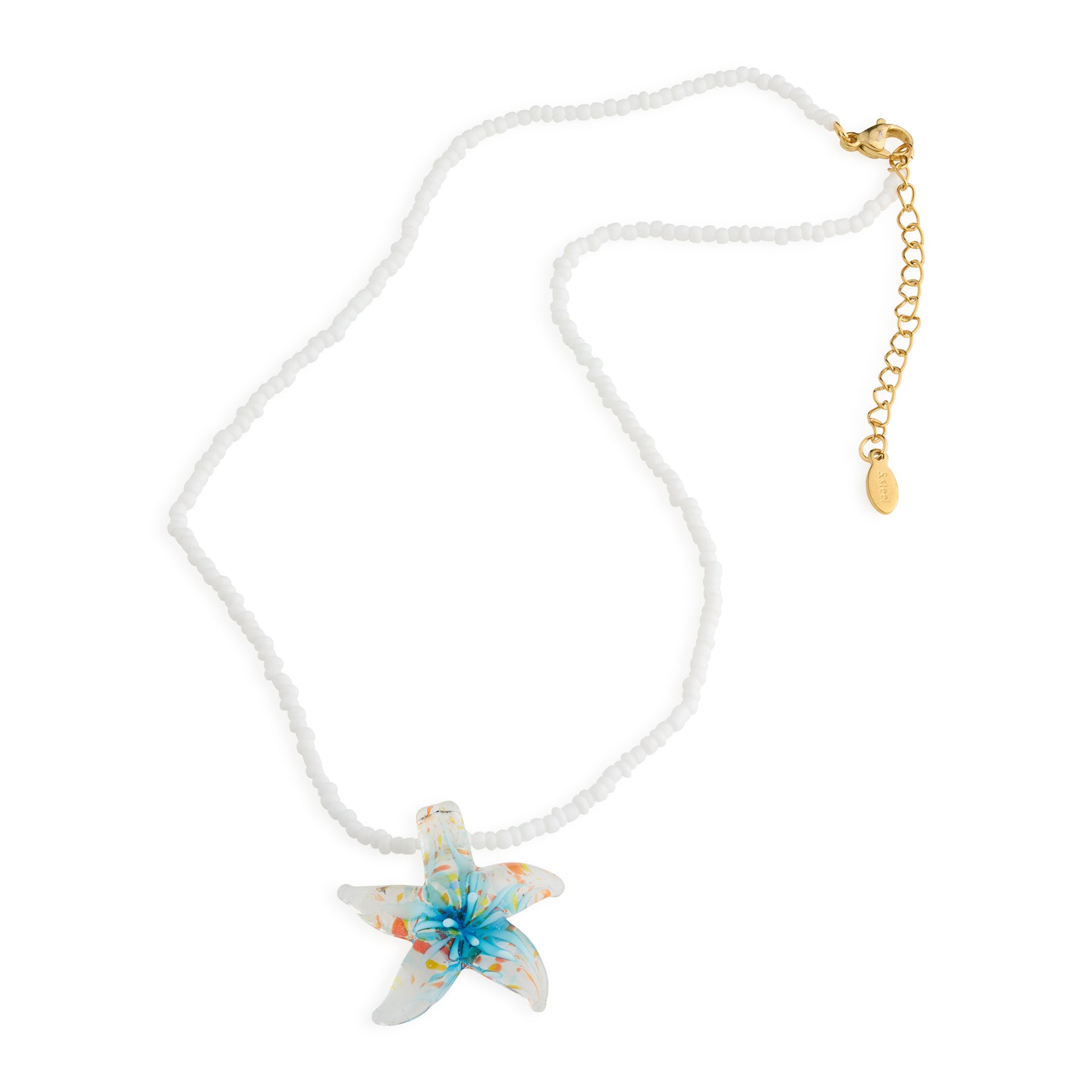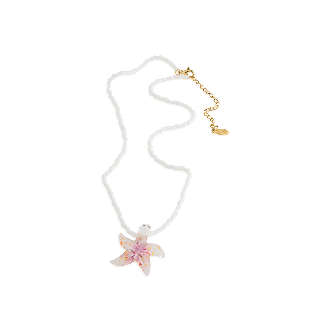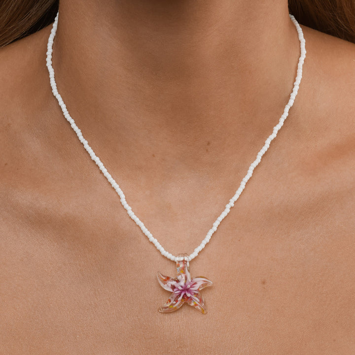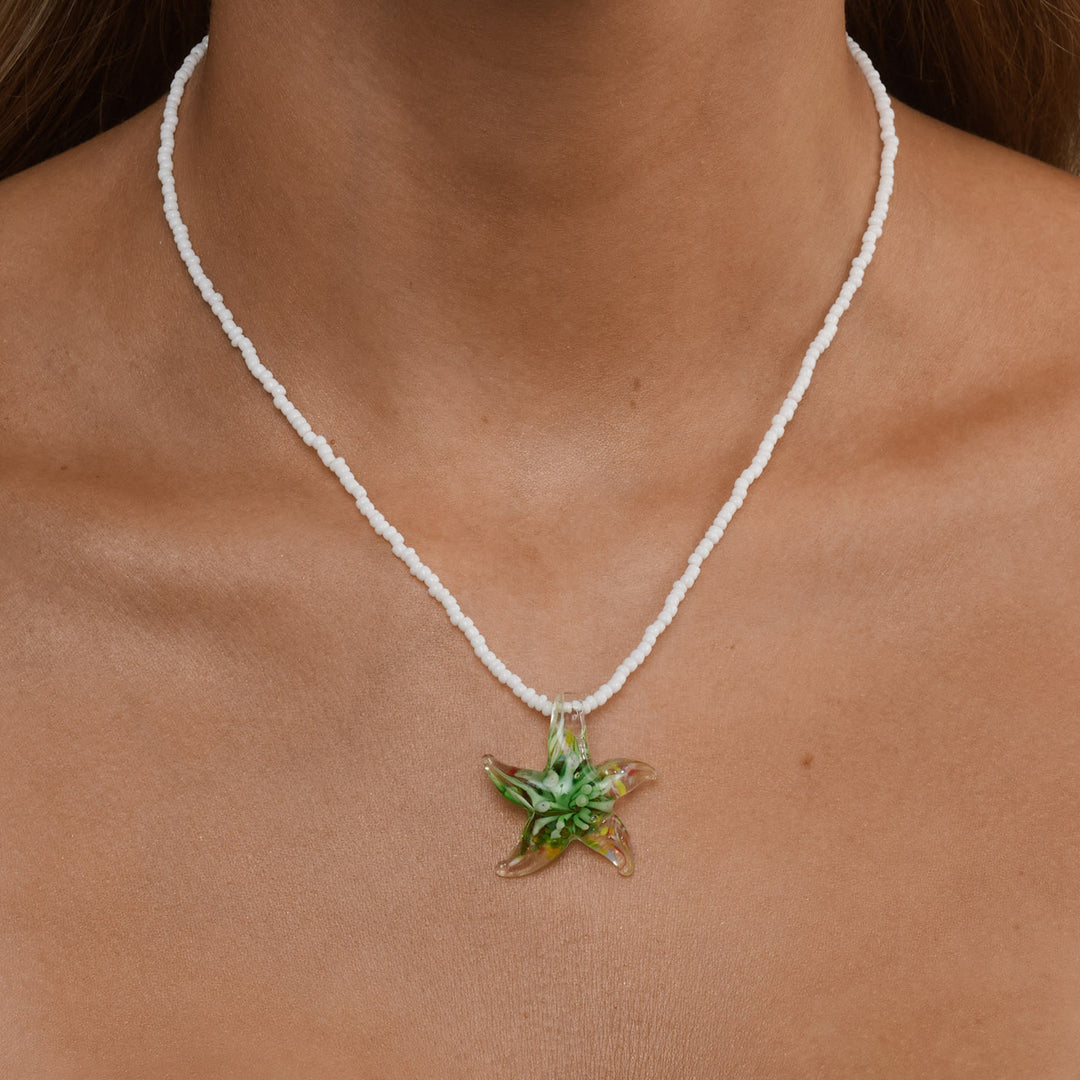 Ocean energy, locked in glass. The Serafina necklace features a handmade glass starfish in dreamy sea tones, strung on a delicate chain made from small white beads. Light, playful and perfect for channeling summer – even when you're far from the beach.