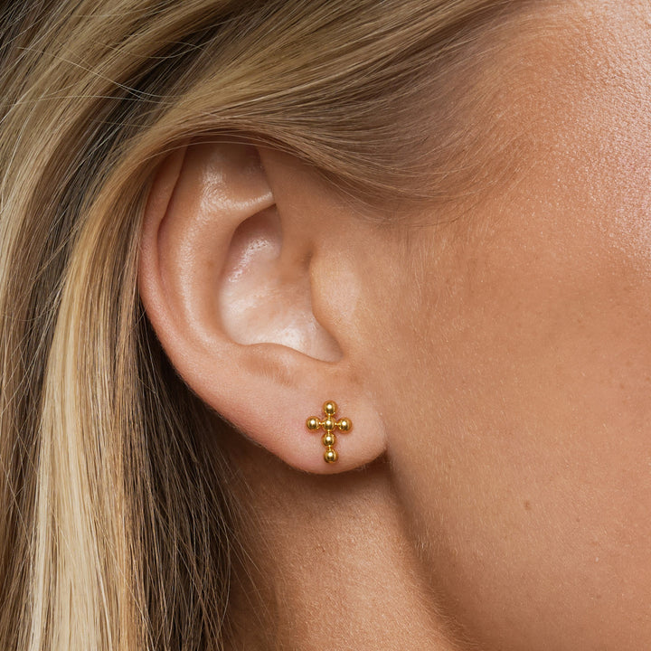 Tiny, shiny and full of attitude. The Tia mini cross earrings bring playful edge to your ear stack. Luxe finish and lightweight feel. Available in silver & gold.