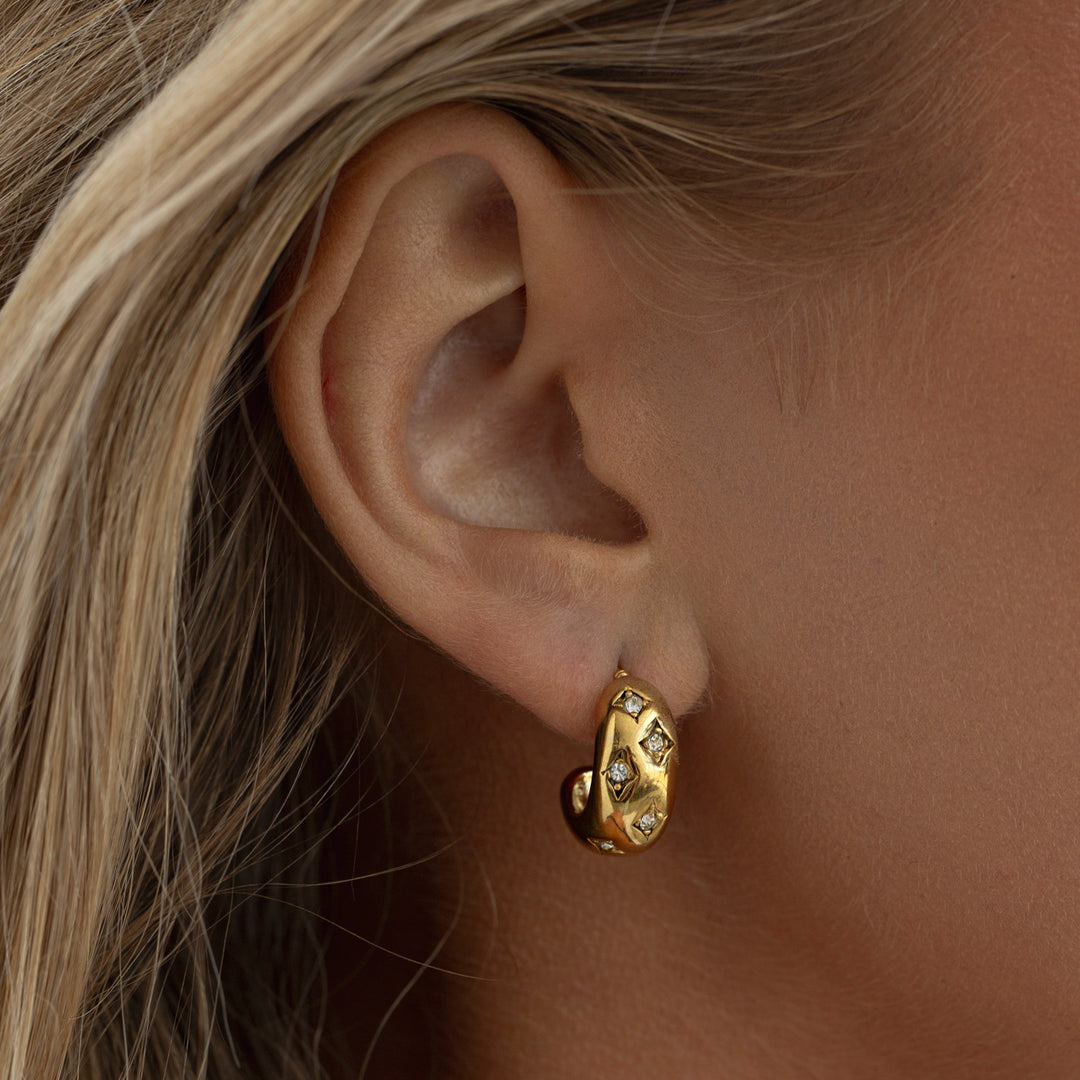 Elevate your style with the Vilma Crystal Hoops. Crafted from waterproof stainless steel, these versatile hoop earrings are adorned with shimmering crystals, offering both durability and timeless elegance.